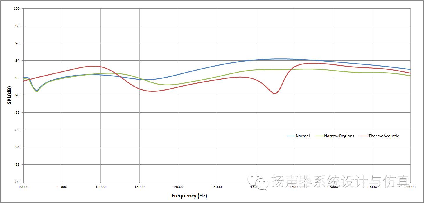 对比常规线弹性声场模型、狭缝声场模型、热声场模型。10-20kHz频率响应。