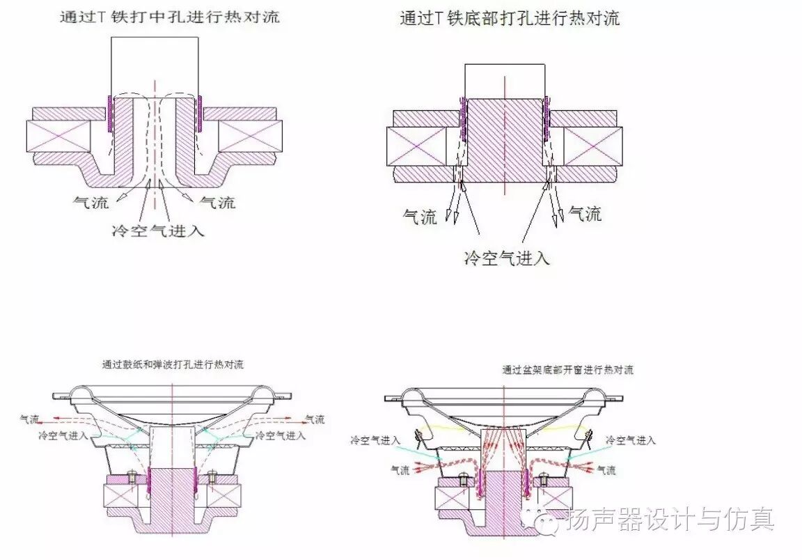 由于激励(电信号输入,通常是粉噪),以及边界条件过于复杂,很难抽象为简单的模型。准确的模拟需要考虑电场,磁场,热场,结构力学,流场等的耦合。音圈是主要热源,温度上升反过来又会造成音圈直阻上升,从而影响发热功率。磁路中的感应电流是次要热源 (金属件,包括T铁,夹板,短路环等会产生涡流,生成次级热源),跟电信号激励的频率等又相关。音圈(热源)上下运动,振膜也跟着运动,空气也会参与强迫对流。