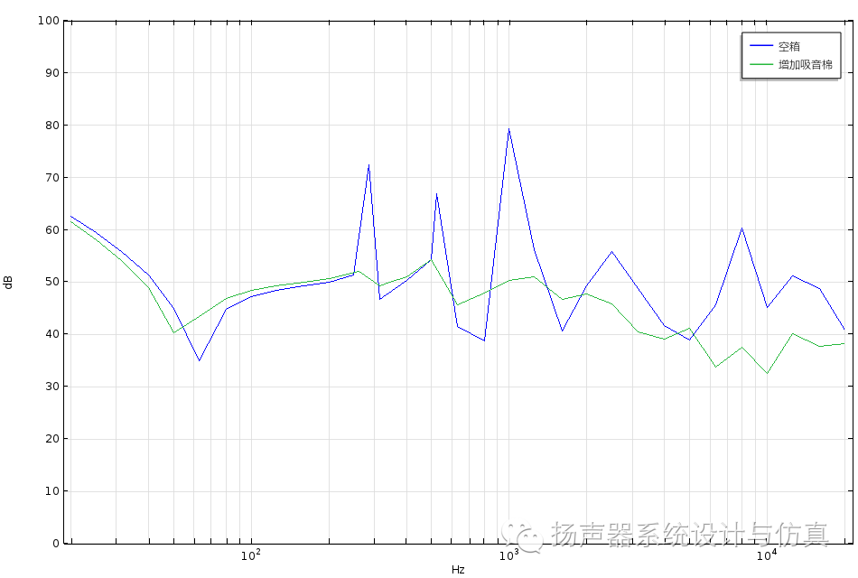 下图是一定条件下空箱和增加吸音棉对扬声器频响影响的差异。可以看到某些频段增加吸音棉可以减少箱内驻波对扬声器频响的影响。