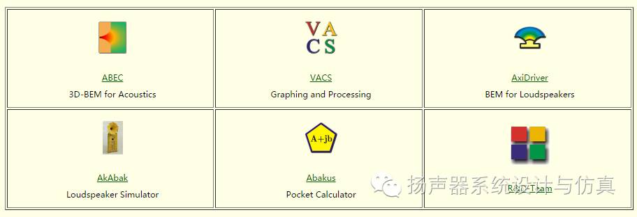 包括ABEC,推荐的声学3d边界元软件,可以用来模拟号角/箱体衍射等; VACS,专用的声学数据处理软件,做了不少针对扬声器的优化; AxiDriver,2维边界元软件,用处好像不大; AkAbak,模拟等效电路的,与其他软件相比无太大优势; Abakus,小型计算器。