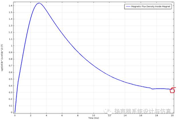 铁氧体磁铁磁通密度随充磁时间变化的曲线。 最终稳定的值就是磁铁剩余磁通密度Br,约等于0.35T。