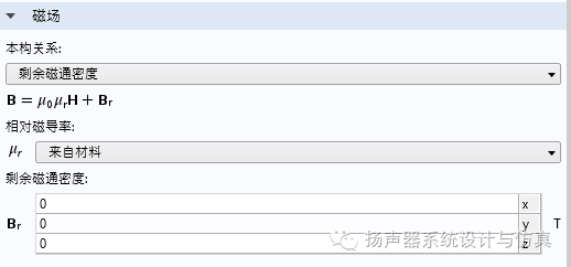 在个人使用过的磁场仿真软件中,唯有Comsol比较奇葩。只能通过相对磁导率μr,和剩余磁通密度Br来定义磁铁参数。 一般会指定一个相对磁导率μr来进行计算。