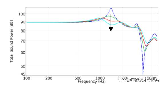 下图是仿真对比不同谐振腔体的口径对频响曲线的影响。蓝色是无谐振腔体曲线,其余三条分别对应不同口径的频响曲线。