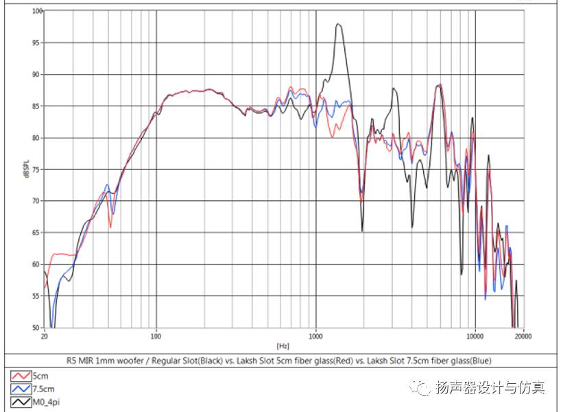 实测验证声滤波器效果的对比。下图中黑色曲线是未加声滤波器前的曲线,红色是填充低密度玻纤,蓝色是填充高密度玻纤。