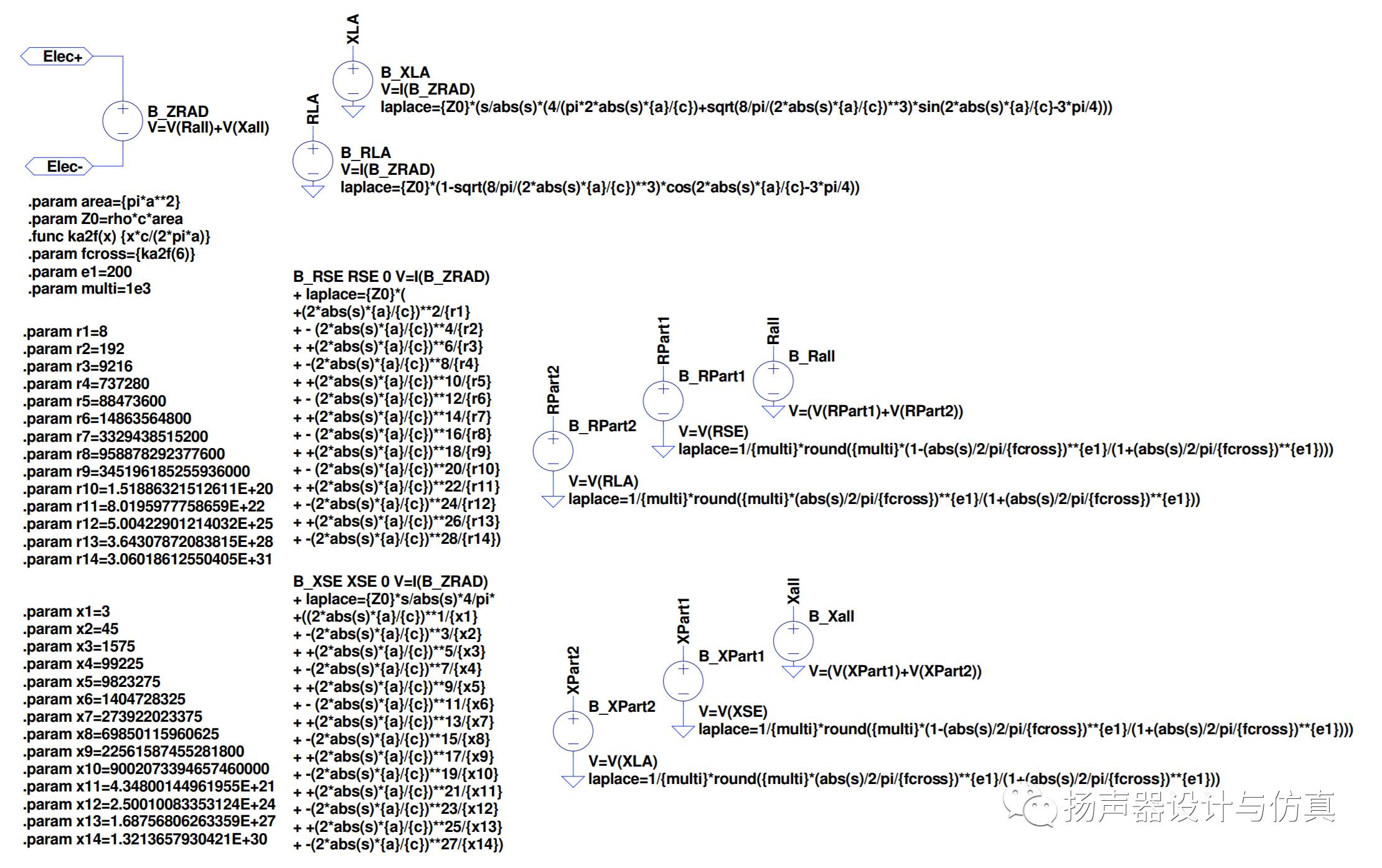 因此,Scott Porter和Stephen Thompson在2009年AES 127th会议上发表了一篇论文《A Preliminary SPICE Model to Calculate the Radiation Impedance of a Baffled Circular Piston》,提出一种计算圆形活塞辐射的SPICE子电路,使得所有频率的辐射阻抗都达到良好的近似。