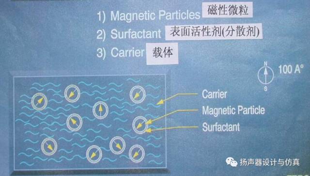 磁液主要成分是超细磁性颗粒(10纳米级别四氧化三铁)、表面活性剂(防止磁微粒凝聚)和载液(水,烃类,酯类油脂等)。