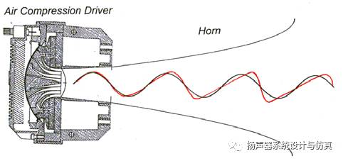 当声压非常大的时候,声波在号角内的传播过程中,不同位置的压力大小不一造成传播速度的差异,容易造成波形的失真。主要是二次谐波失真。