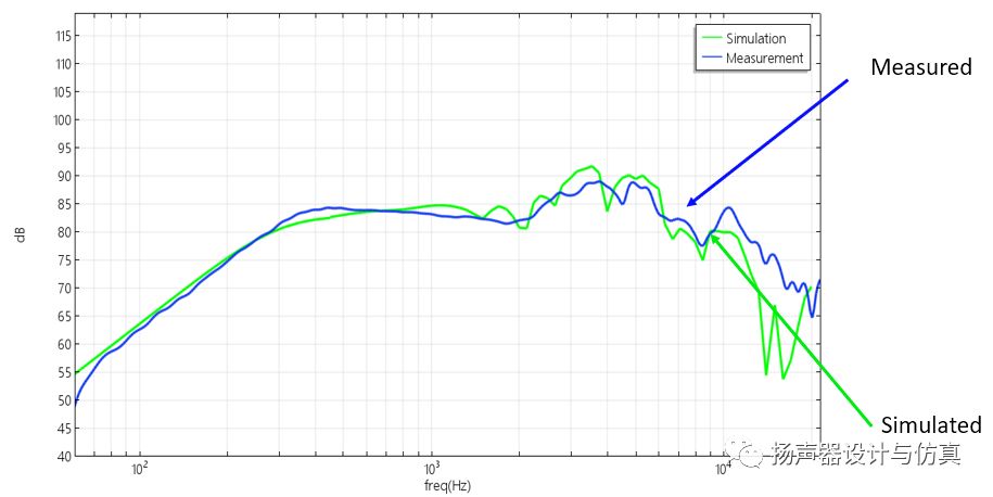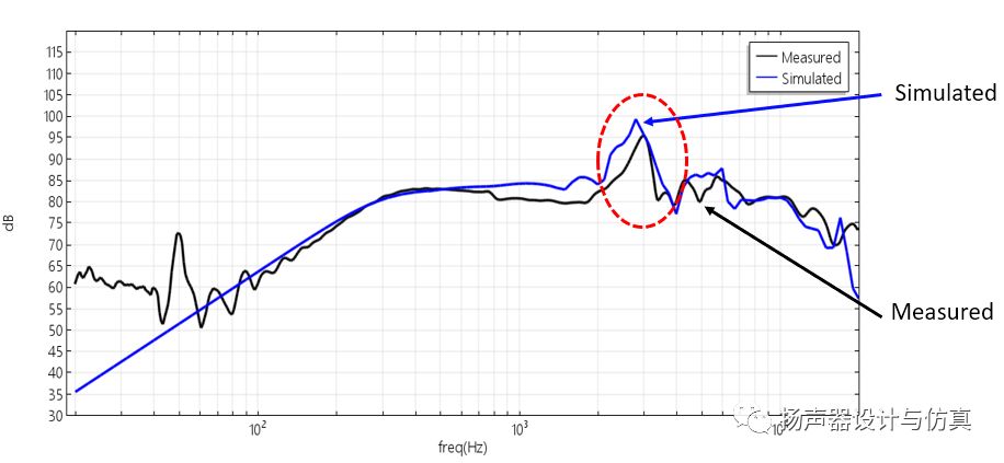 目前带反射锥的样品在3kHz附近存在一个非常高的峰。下图是仿真和实测的对比。峰谷的位置吻合得还不错。
