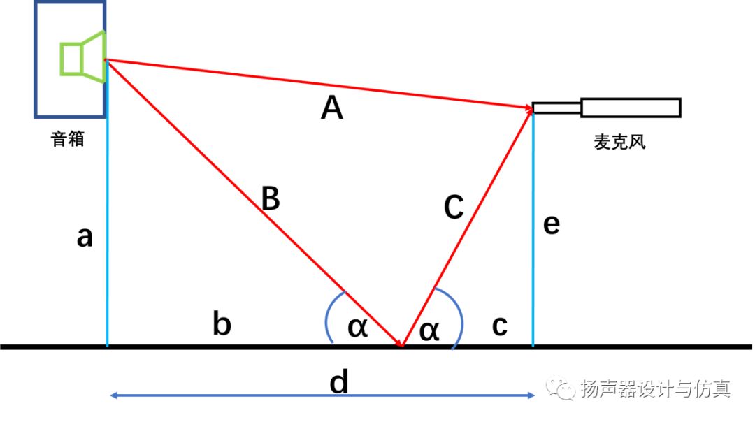 下面推导一下由于地面反射造成的音箱测试频响曲线谷的频率计算公式。