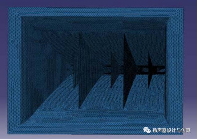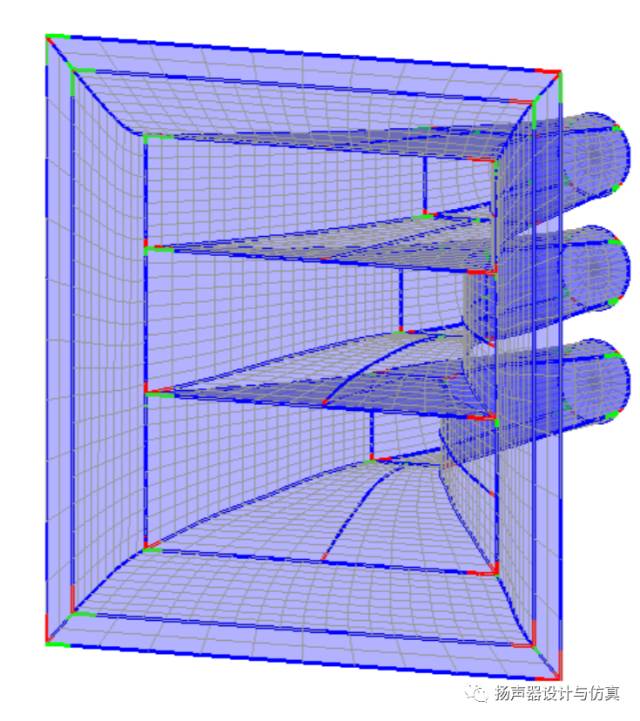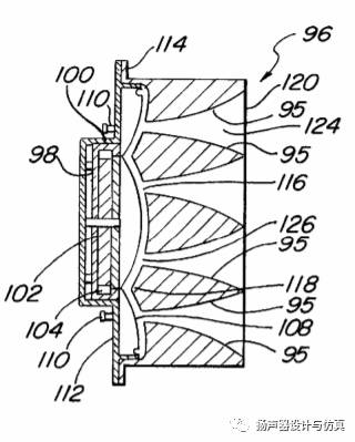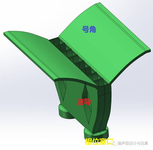 常规线阵音箱上使用的波导和号角是分离开的。方便单独设计。声波从振膜发出,通过相位塞出来,然后经过波导管的通道形成平面波,最后通过号角控制指向性辐射出去。