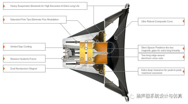 散热器集成到驱动器的铸铝框架中,并且钕铁硼磁体被放置在驱动器的双音圈组件内部。很多关键性能参数都大大提高,包括最大的功率输出和失真。