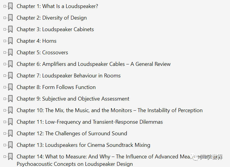 涵盖了从扬声器单元,音箱,分频器到功放,混音,监听,和环绕声等内容。无论是在录音棚,广播工作室,还是在家中使用音响系统,都会有参考价值。