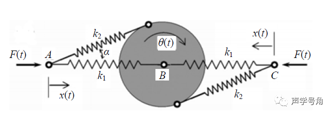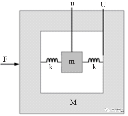 在频率为ω外力F的作用下,组元1的位移为u,组元的运动位移为U。