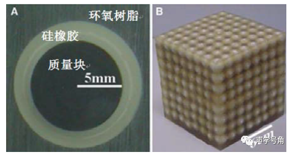 将用硅橡胶包裹的铅块,按立方晶格结构嵌入到环氧树脂的基体中,此时铅块充当质量块,硅橡胶起到弹簧的作用,环氧树脂作为基体。在低频处,就会出现铅块和基体运动失谐的情况,产生了负等效质量密度,同时由于铅块运动能吸收声波所传递的能量而在低频处产生禁带。