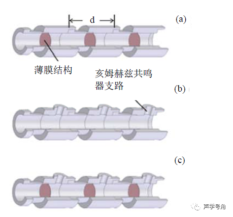 采用周期排列亥姆赫兹共鸣器作为支路,利用单极共振来实现负等效模量,同时在通道中加入薄膜型超材料通过偶极共振来实现负等效质量密度。