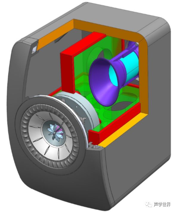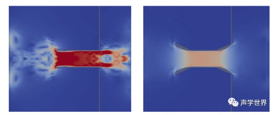 扩张的管道,相比于直管,可以减少湍流噪声。通过有限元模拟,可以预测最优的管口尺寸以及扩张率,以降低噪声和大输出下的功率压缩。