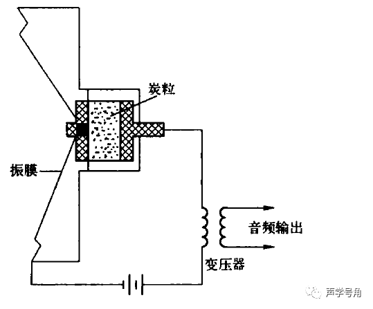 声压作用在振膜上,使得炭粒受到的压力发生变化,从而导致接触电阻变化,使得两端输出电压改变。