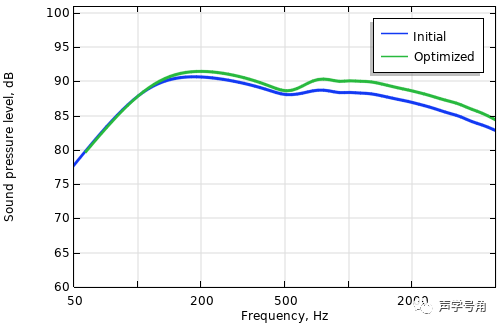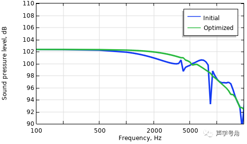 使用瑞利积分计算的1m轴线处的优化前后频率响应曲线。在较高频率段声压级提升。