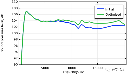 优化前后的频率响应对比,高频更平坦,且输出声压级更大。
