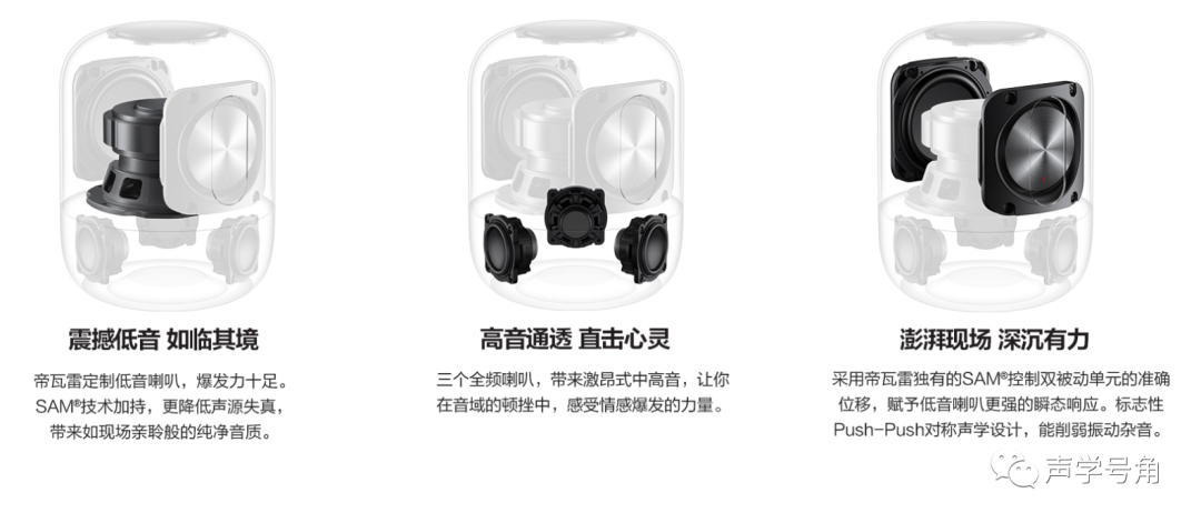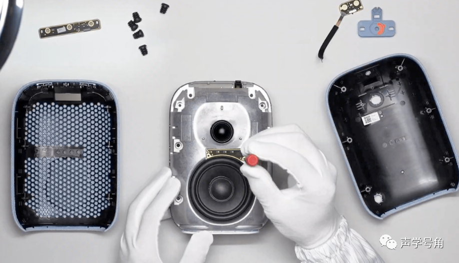 华为Sound智能音箱还是和Sound X一样,是和帝瓦雷一起合作开发的。一个低音单元,两个无源辐射器,三个全频单元。