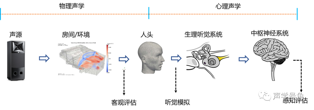 扬声器或者其他产生一个声源,声音通过房间/环境传播,绕过人头传入双耳,并听过生理听觉系统和中枢神经系统,从而感知到声音信号。分别牵涉到物理声学和心理声学。