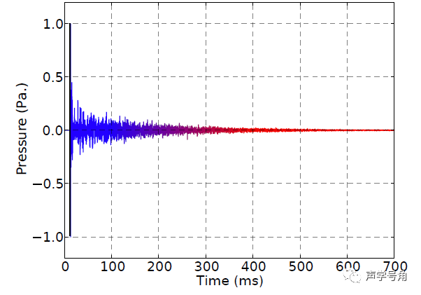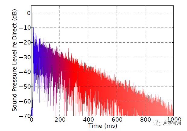 一个1700m^3小型音乐厅的声学测试结果。其中声场的直接能量标记为黑色,早期反射能量标记为蓝色,蓝色之后的渐变属于混响场的建立过程。