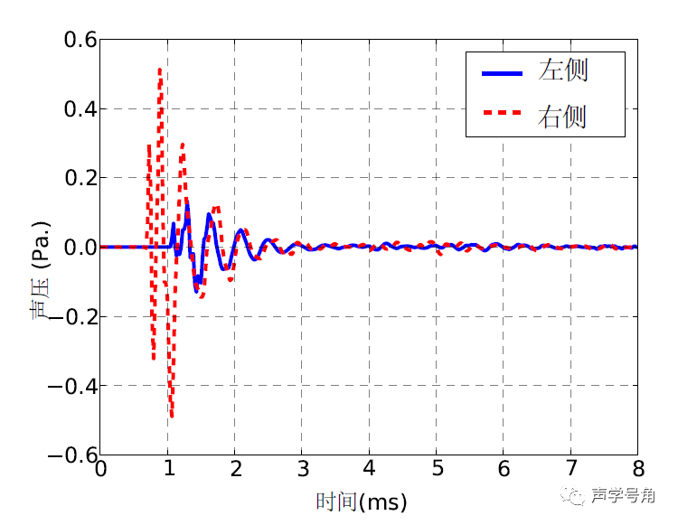 HRTF和BIR是等效的。下图是45°是左右耳的BIR响应:
