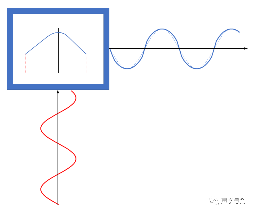 上图左上角表示Cms(x),红色曲线表示激励的电流或电压信号。右上角的蓝色实线表示实际时域位移曲线,蓝色虚线表示理想的位移曲线,当然实际的位移幅值应该也会所有压缩。实线和虚线的差异就会造成失真。