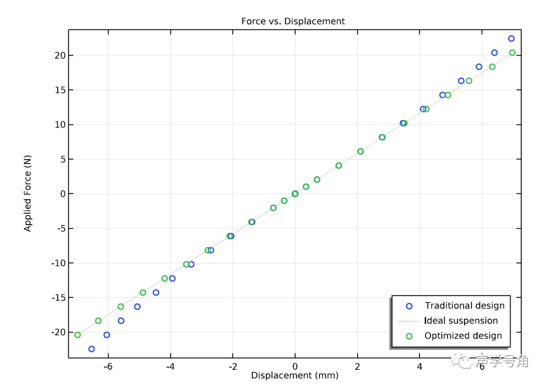 该模型演示了弹波的有限元形状优化。通过改变弹波形状,创建一个新的几何形状,使得弹波的刚度在整个运动范围内都呈现线性变化,从而大幅度降低扬声器的失真。