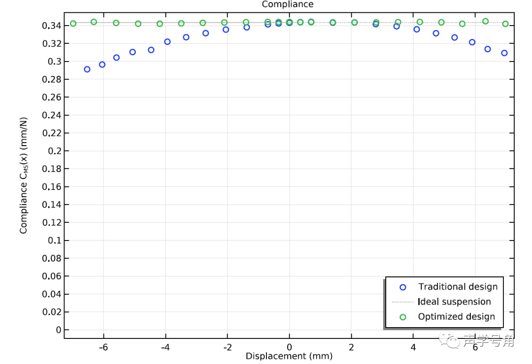 而弹波的刚度会随着音圈上下运动的位移而发生变化。这种变化的非线性在扬声器的失真中起到重要影响。一般以Kms(x)或Cms(x),即刚度或者顺性和位移的关系曲线来表征。