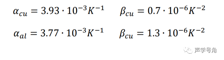 上式中, 是音圈在环境温度 下的直流电阻, 和是和材料相关的系数。音圈导线材料通常是铜(cu)或铝(al),已知: