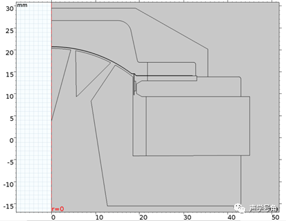 图1为本文所讨论的几何模型,对称轴为 r = 0 处的垂直红线。要注意的是压缩驱动单元附近的区域也是几何模型的一部分,代表了空气区域,这对于求解全耦合问题是必不可少的。此时扬声器相当于完全放置于空气中。