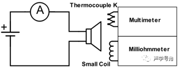 在与仿真模型相同的边界条件下开展相关测量工作。使用电流表测量音圈中的电流,从而计算出音圈电阻,再通过音圈电阻的变化情况来测量音圈温度。采用两种方法测量背板温度,测量结果取平均值:1)将一个热电偶放置在背板小孔中测量,并用导热膏粘接;2)将一个无支撑的小音圈粘在背板上,通过其直流电阻的变化来测量。图2为测量设置示意图。