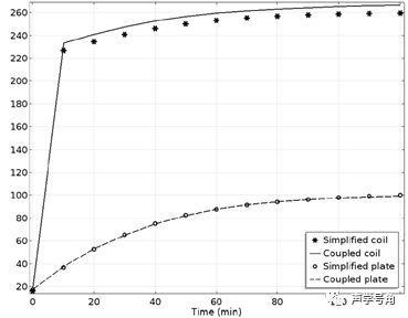 在COMSOL Multiphysics软件中可计算水平平板(压缩驱动单元的上表面和下表面)和垂直壁(磁钢、前片和背板的外表面)的传热系数。该方法仿真计算时间仅需18秒。结果表明这些传热系数提供了非常有用的近似效果。如图5所示,简化模型的音圈温度仿真分析结果偏低,而背板温度影响不大。