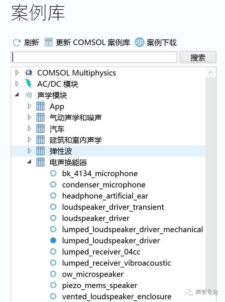 电声相关的案例库Comsol软件自带有,包含扬声器、麦克风、音箱、耳机、助听器等模型。已经涵盖了大部分常规的电声仿真模型。