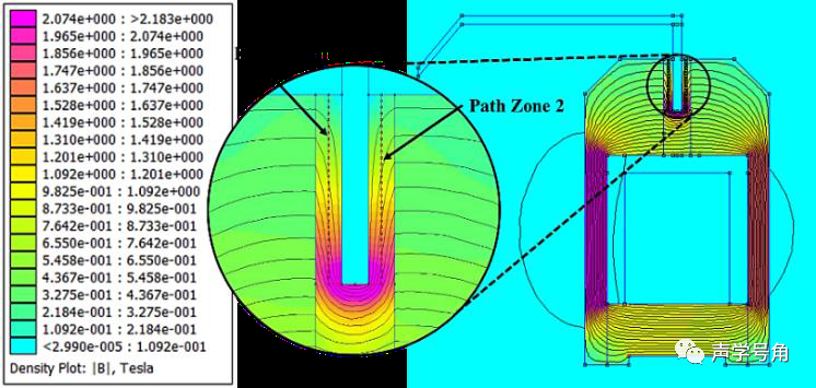 对外侧磁回路的仿真,和常规扬声器磁回路仿真类似。可以采用有限元方法(FEM)。使用Femm/Comsol等工具都可以轻易实现。