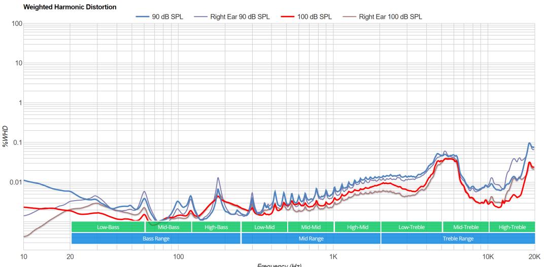 Rtings测得的频响曲线和谐波失真(以下测试曲线默认引用Rtings数据,不再补充说明):