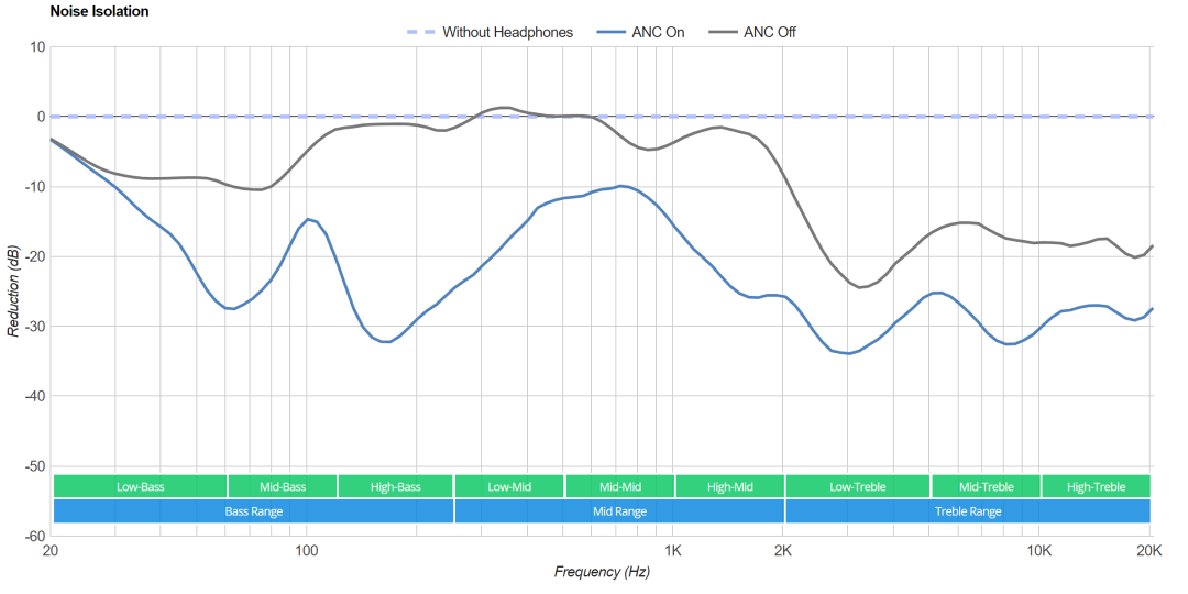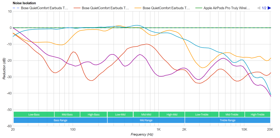 和苹果Airpods Pro对比,可以看到Bose大鲨低频降噪比Airpods Pro,但中频略差。