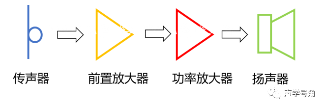 一个最简单的单声道厅堂扩声系统示意图,结构简单,功率较少