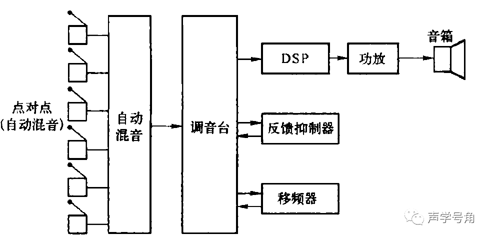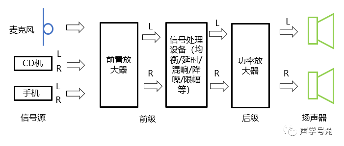 扩声系统(Sound Reinforcement System)是将传声器、CD机、录音机等信号源传输过来的语音或者音乐信号进行放大、控制以及美化加工,最终送到扬声器或耳机,还原声音信号/声场信息供人聆听。