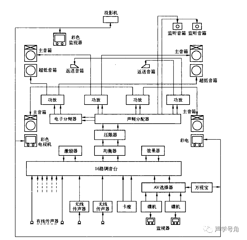 下图是一个多功能厅堂专业扩声系统示意图,以16路调音台为中心组成,适用于剧院、礼堂、影院厅、演唱会等。