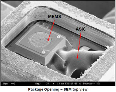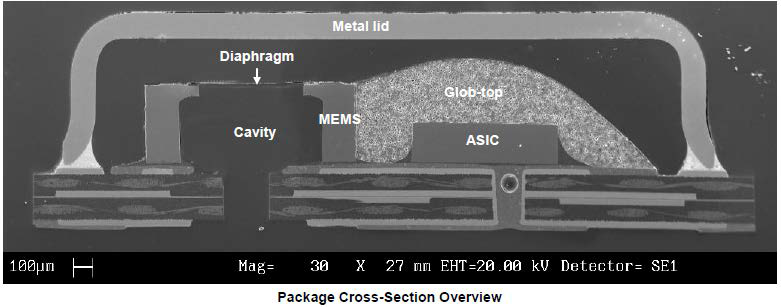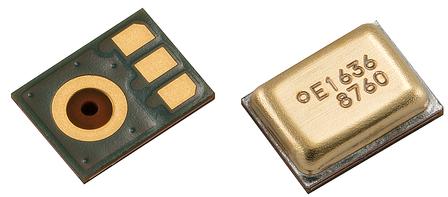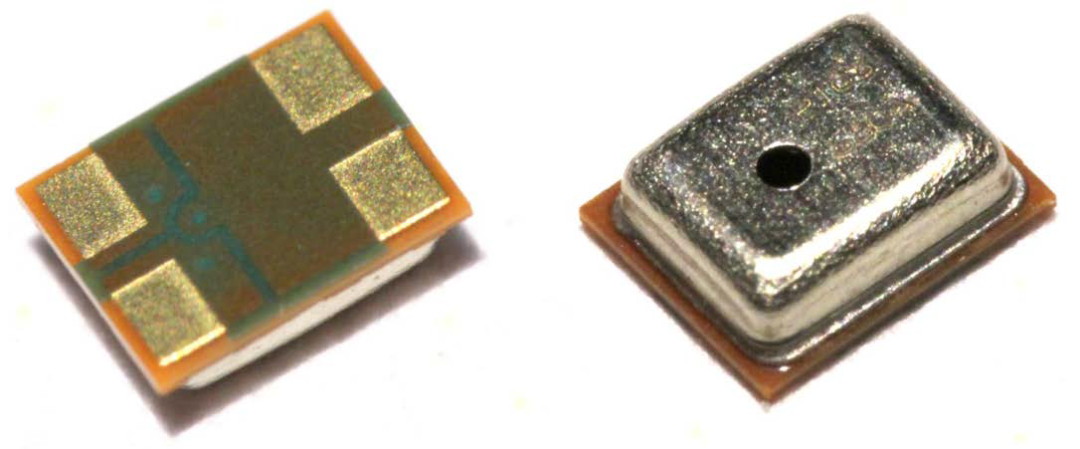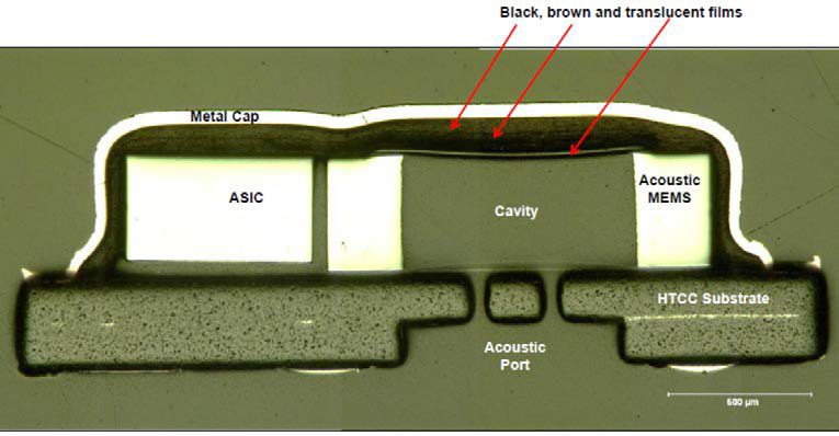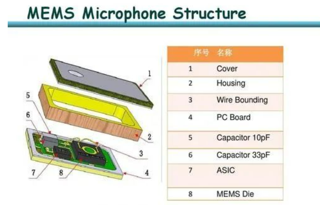 几款MEMS麦克风内部图像,底部是PCB板,顶部是金属外壳,内部由MEMS芯片(背板、振膜)、ASIC、印刷电路板、空腔等组件构成。