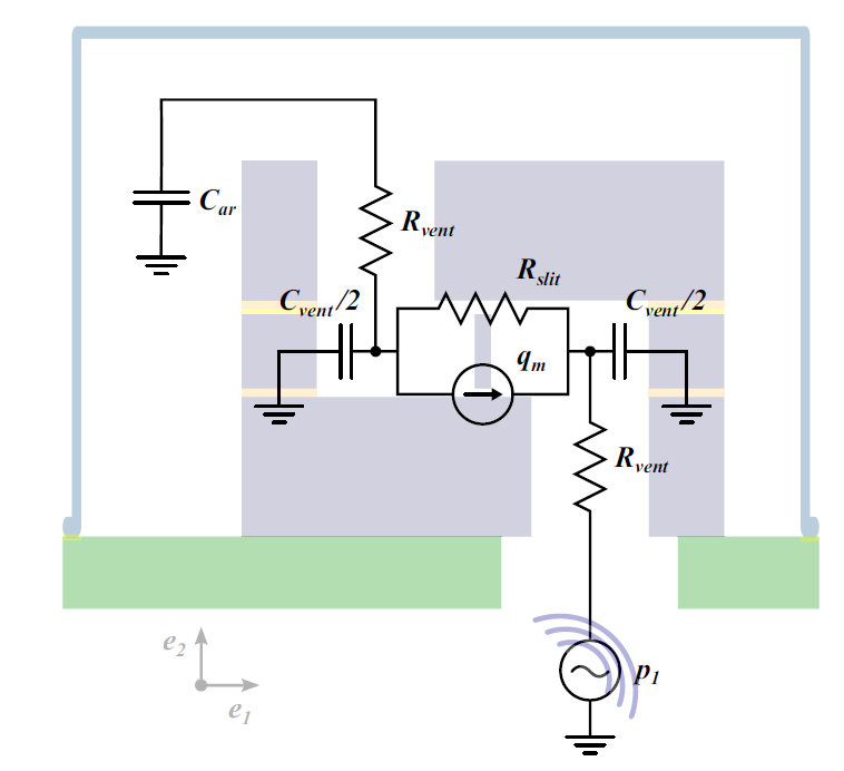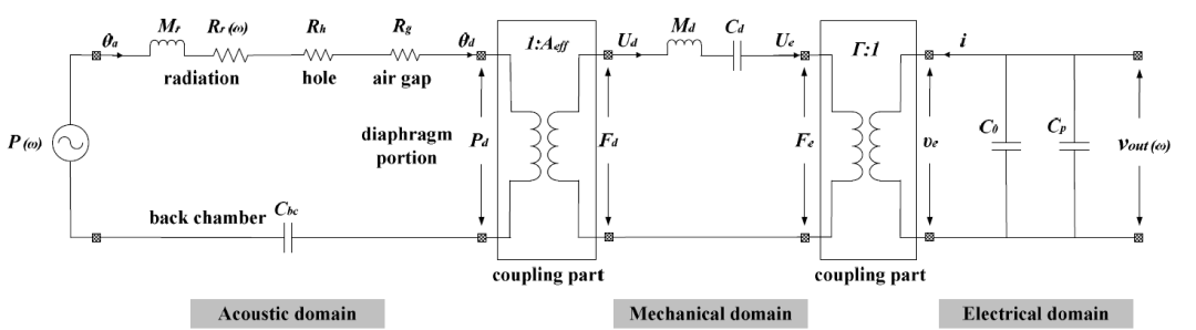 关于电容式麦克风的仿真,通常会采用集总参数拟合等效电路的方式,将电、结构、声都类比为电路进行计算,可以很快地计算其灵敏度和频率响应。