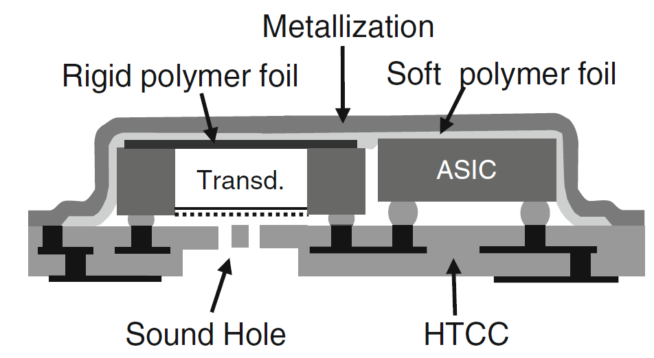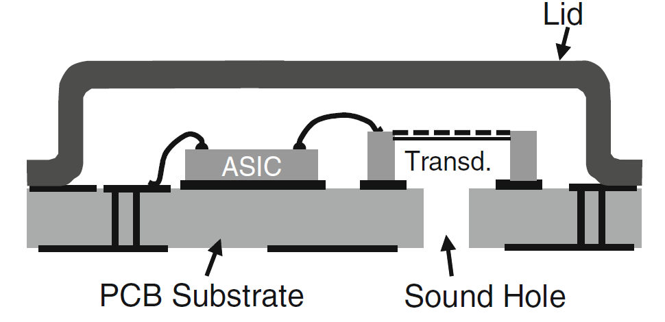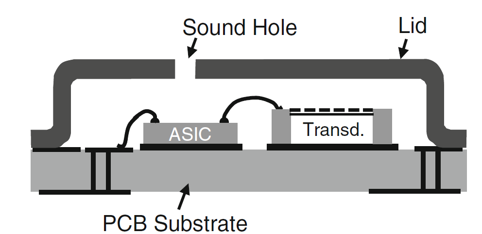电容式MEMS麦克风出于不同应用和工艺的考量,会有不同的封装方式。入声孔有些开在外壳上,有些开在PCB板上。