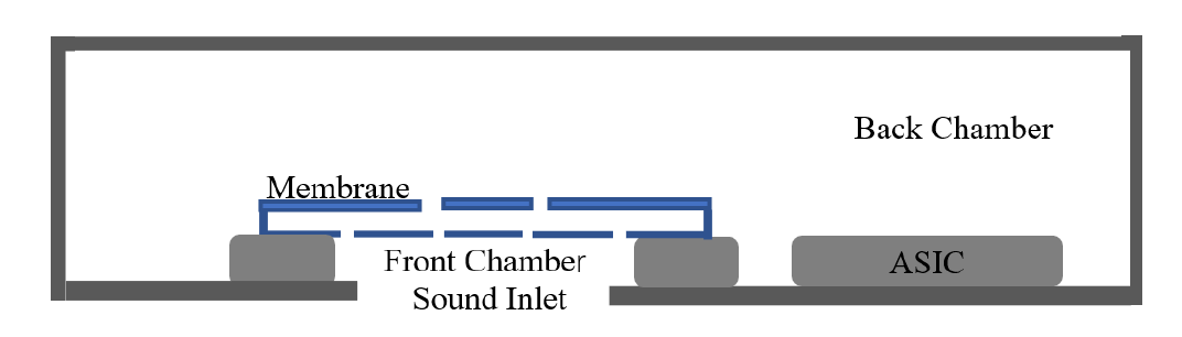 对电容式麦克风来说,其声电换能机理是:声压驱动膜片振动,造成膜片和背板之间的空气间隙d发生变化,从而其电容值C变化,最终输出电压ΔV。ASIC再读取平板电容的电压并进行处理。