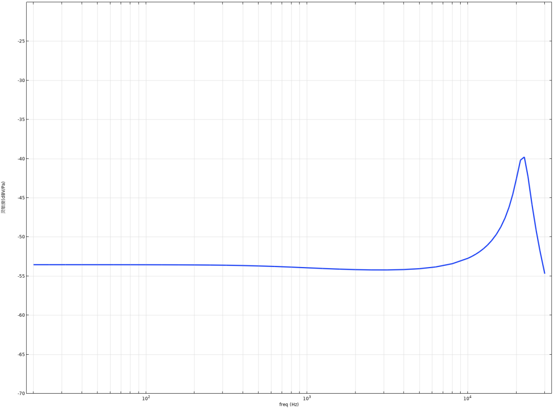 仿真得到麦克风的频响曲线,1kHz灵敏度-54dBV/Pa
