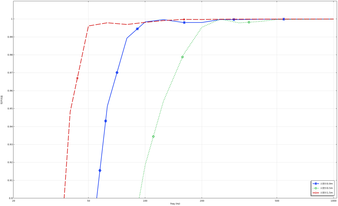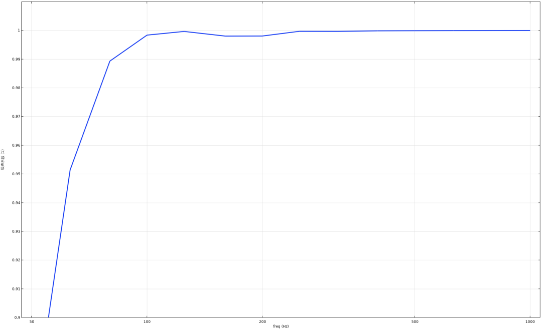 下图是仿真一种设计下不同频率的吸声系数,纯尖劈长度0.9m。其低频截止频率(吸声系数>0.99)在80Hz。