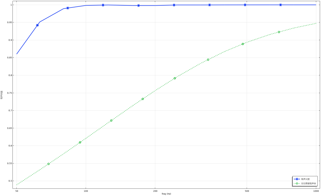 可以发现吸声尖劈的效果远远好于同尺寸同材料的均匀厚度吸声体。