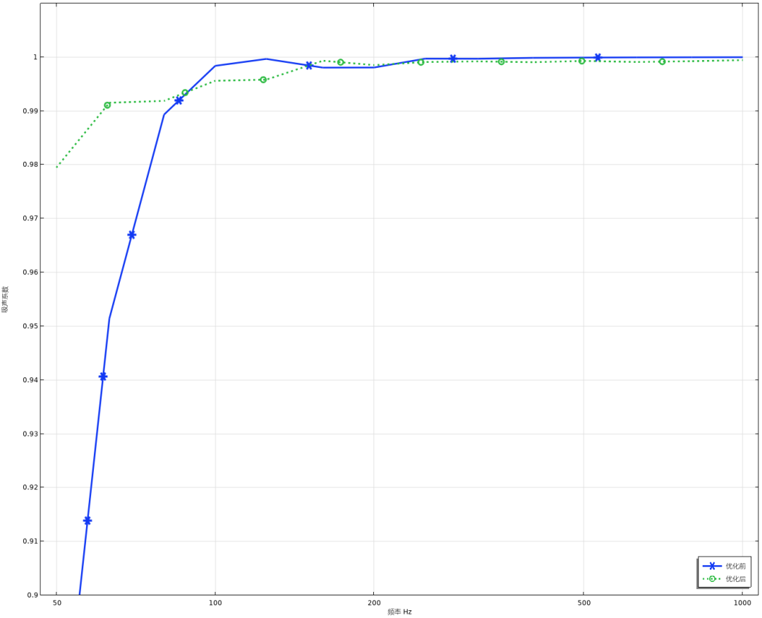 优化前后的吸声系数仿真对比: