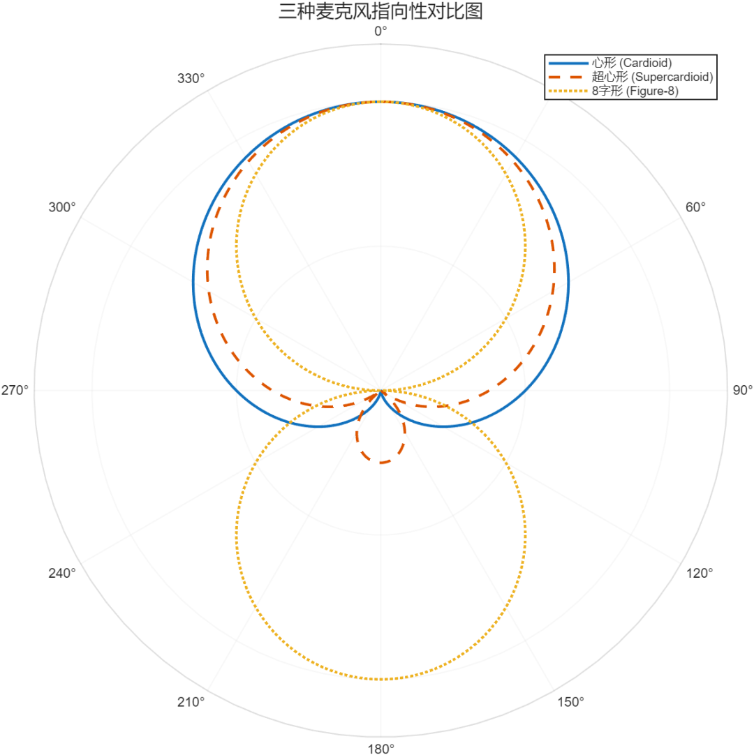 • 心形指向: 只录正前方的声音,能有效屏蔽侧面和背后的杂音。这是最常用、最万能的模式。也有超心形指向性
